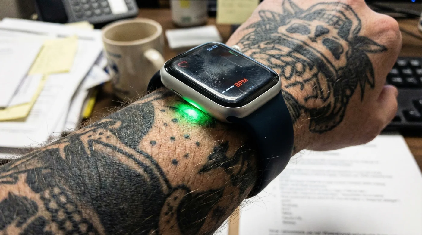When your heart beats, the blood flow in your wrist—and the green light absorption—is greater. Between beats, it is less. By flashing its LED lights hundreds of times per second, the Apple Watch can calculate the number of times the heart beats each minute. However, this system relies on the skin being a relatively translucent medium that allows light to penetrate to the blood vessels and bounce back to the sensor. This delicate optical dance is exactly where ink creates chaos.