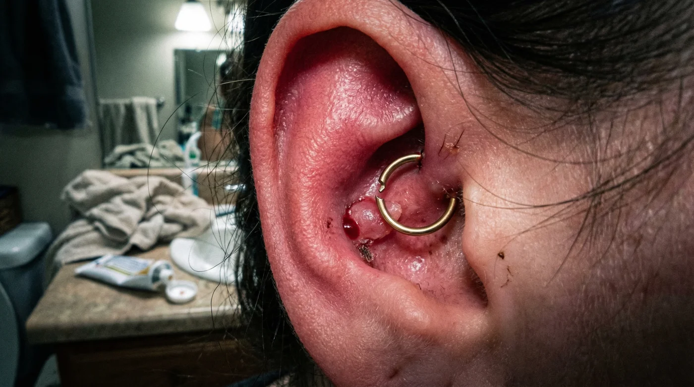 Recognizing the difference between normal healing and mechanical trauma is critical for saving your piercing. Normal cartilage healing involves minor swelling (edema), mild redness (erythema), and the occasional secretion of pale lymph fluid. However, when Seamless Gold Rings are actively tearing the tissue, the body sends extreme distress signals.